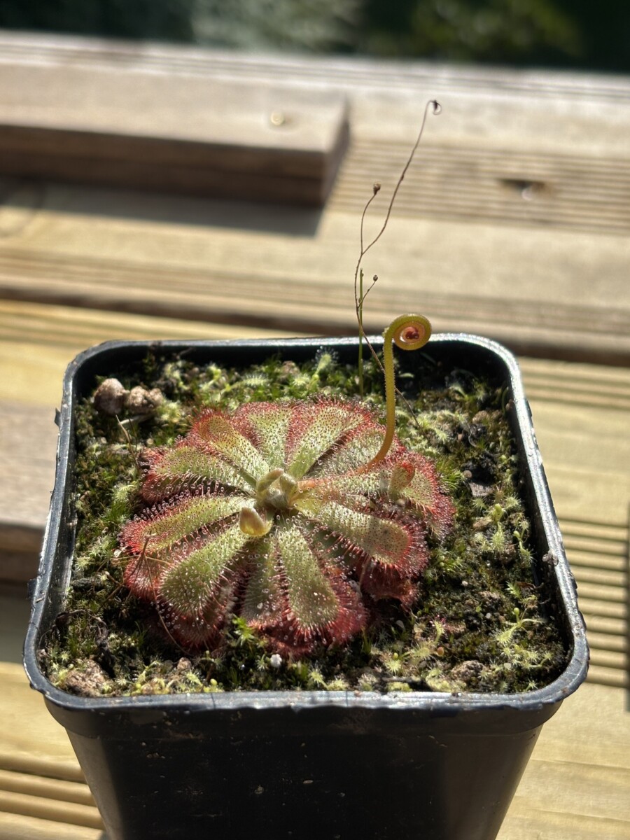 Vends un pied de Drosera admirabilis localité ‘Ceres, SA’ (Afrique du Sud) en très bonne santé. Rosette bien formée, feuilles spatulées rouge vif avec mucilage abondant. Hampe florale en cours au moment des photos.