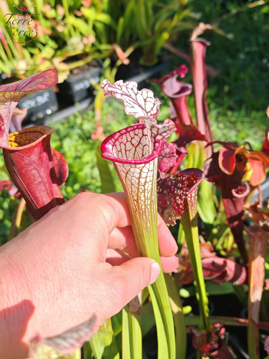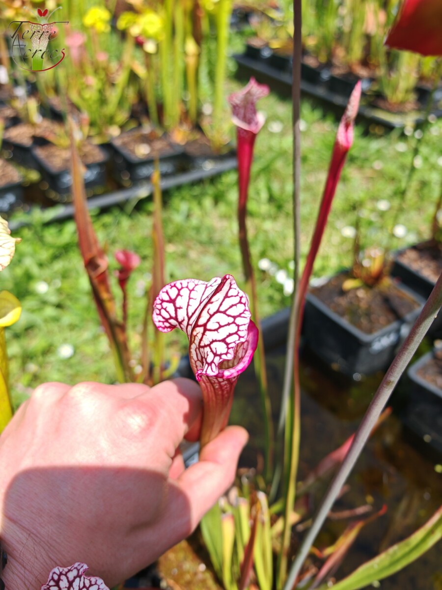 Magnifique Sarracenia hybride obtenu à partir de nos graines. A l’ouverture les pièges ont une magnifique couleur rose qui tourne rapidement sur un rouge bordeaux avant de s’éclaircir en maturant pour finir blanc avec une lèvre bien contrastée de rose. Très jolie plante qui sort du lot en collection.